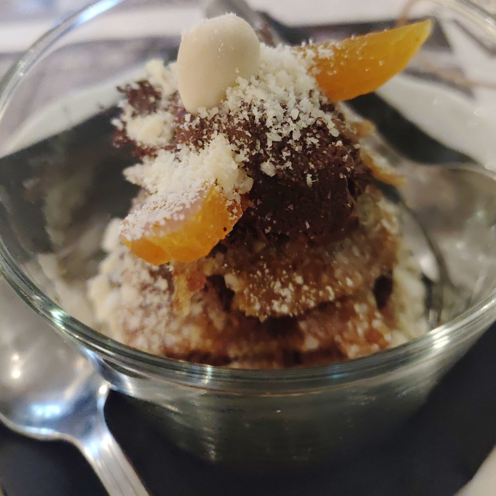 Io poi ho concluso il pasto con un dolcino: il Signor G (riferimento a Giorgio Gaber, per chi non lo sapesse). “El ciculat cont la cannella“. Altrimenti detto: millefoglie morbida di mandorle e cannella con mousse al cioccolato fondente.