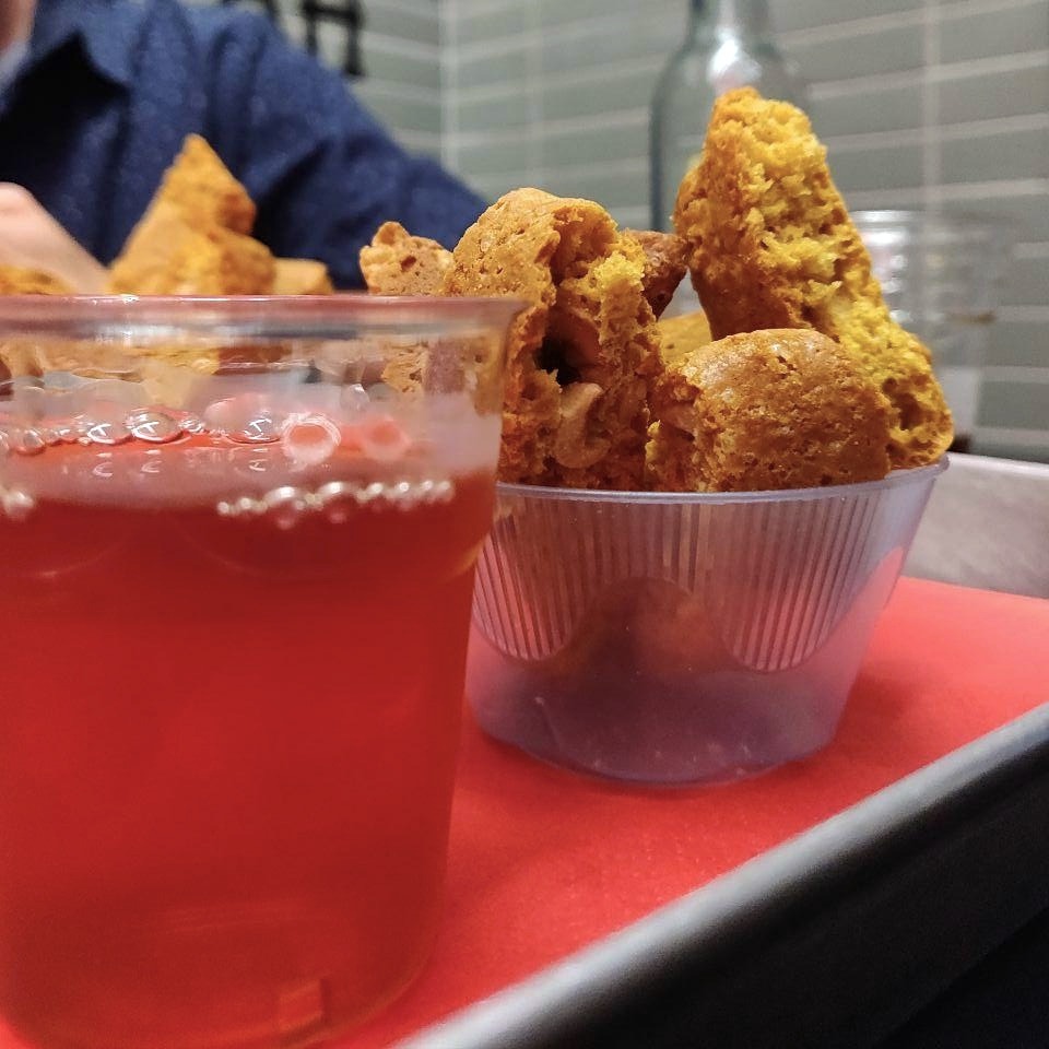 Quindi io e Luca abbiamo smezzato una porzione di patatine fritte per poter poi goderci una porzione a testa di Cantucci artigianali e Vin santo (non scherziamo: questo non si poteva proprio condividere).