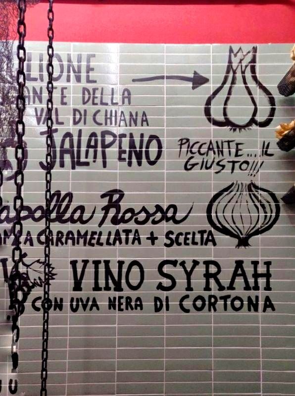 Sulle pareti sono dipinti gli ingredienti e la loro storia