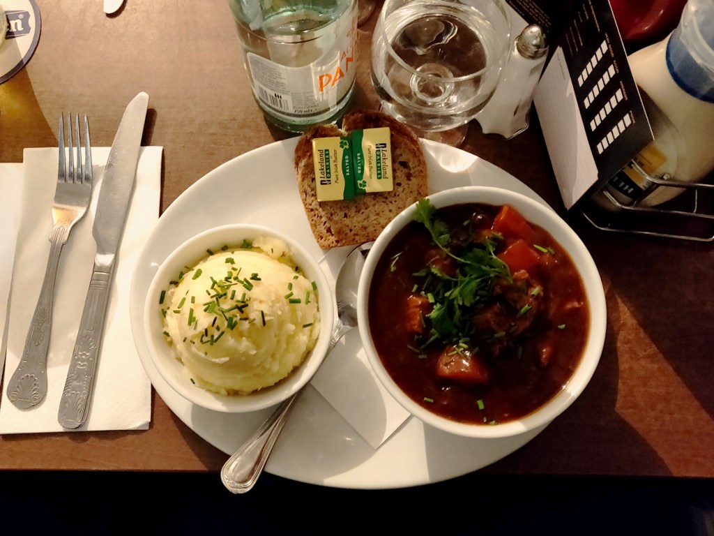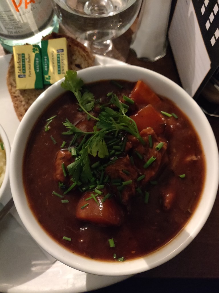 La carne, per quanto tagliata in pezzi un po’ più grossi di quanto siamo abituati noi nello spezzatino (in alcuni casi ho dovuto aiutarmi con coltello e forchetta, altrimenti si mangia tutto serenamente con il cucchiaio), rimane incredibilmente tenera e succosa. Viene cotta con patate novelle e verdura come carote e cipolle (dal menù “root vegetable”, radici) e sfumata sia con il vino rosso che con la Guinness, creando un sugo avvolgente che scalda davvero, nelle piovose sere irlandesi.