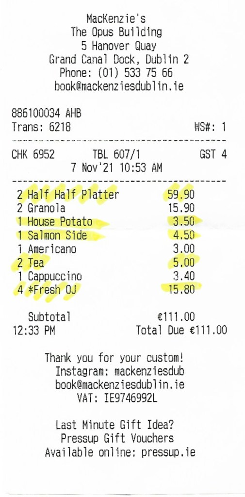 Mentre noi, di norma, abbiamo un menù più o meno fisso con una bevanda fredda, una calda, diverse porzioni di piatti salati (quiche, uova, bacon, salmone etc..) e qualcosa di dolce (che può essere yogurt, pane burro e marmellata o un dolcino), qui hanno una serie di piatti di salato alla carta tra cui scegliere, alcuni anche di diversi assaggi e, ordinabile a parte, piatti dolci come la Granola, yogurt e frutti rossi.