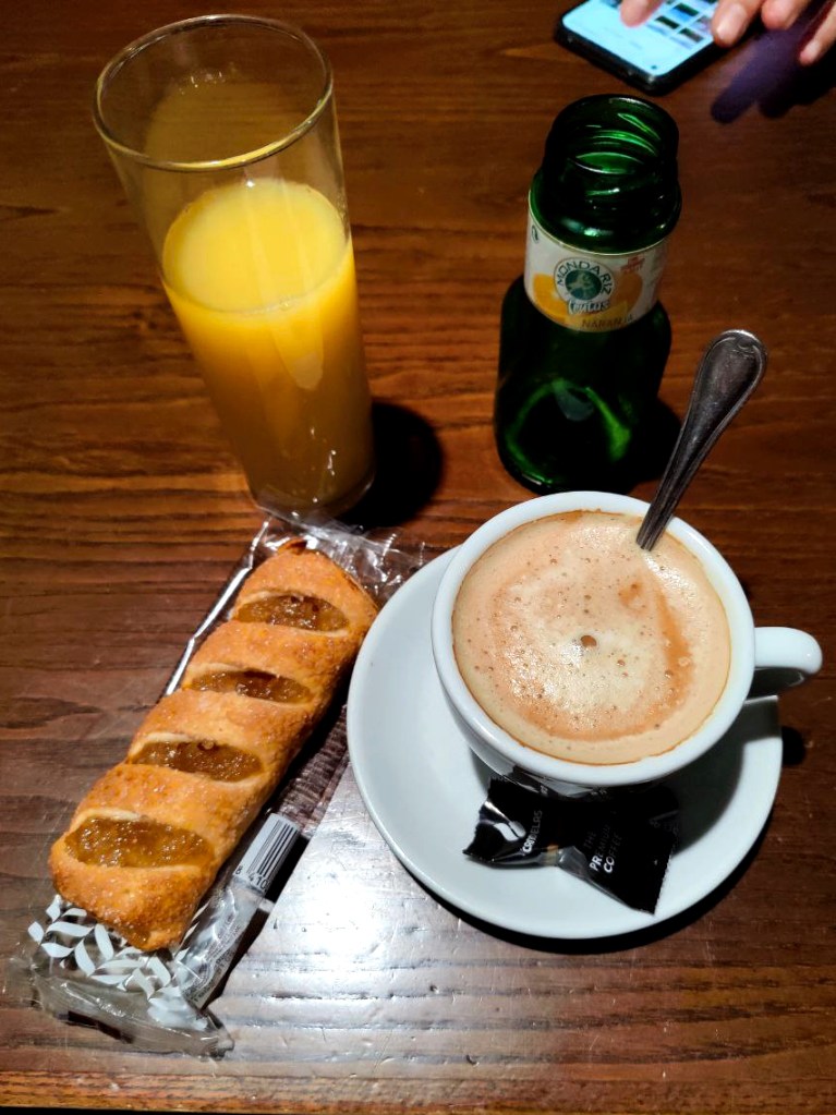 – colazione dagli 8 ai 10 €: per una colazione completa di (pseudo) caffè-latte, brioche o fetta di Tarta de Santiago, e una spremuta di arancia. Noi in più bevevamo un paio di lattine di Aquarius (qualcuno di voi la ricorda?! Vi rinfresco io la memoria 😀), che essendo una bevanda energetica ci restituiva un po’ di sali minerali e ci dava la possibilità di fare una sosta bagno nei bar, senza ricorrere ogni volta alle fresche fresche.